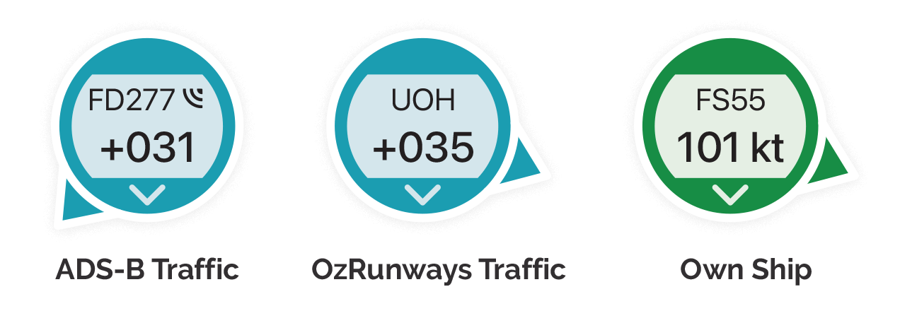 LEARN MORETeal Traffic Bubbles display the callsign and altitude difference in 100’s of feet (relative to your current position) for other OzRunways subscribers currently broadcasting their position. ADS-B traffic is the same teal colour but displays an ADS-B IN Receiving icon, distinguishing it from OzRunways traffic. When OzRunways identifies your aircraft’s ADS-B OUT signal, the bubble turns green to display your Own Ship position.